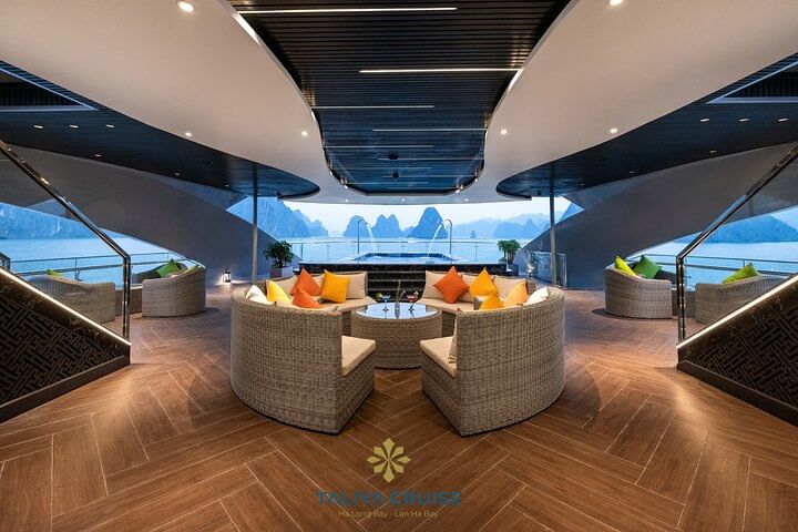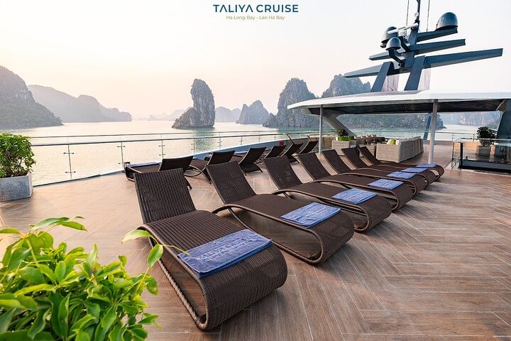 Embark on a 7.5-hour luxury adventure aboard the Taliya 1-Day Cruise through Halong Bay and Lan Ha Bay. Savor a delicious buffet lunch while taking in the breathtaking limestone islands. Explore the Dark and Bright Cave by bamboo boat, kayak in the crystal-clear waters of Lan Ha Bay, and swim in a serene paradise. Participate in a fun cooking demo to make traditional Vietnamese spring rolls, then unwind with a sunset party on the sundeck. This premium cruise combines natural beauty, relaxation, and cultural experiences for an unforgettable day.
