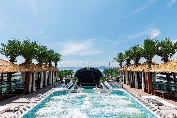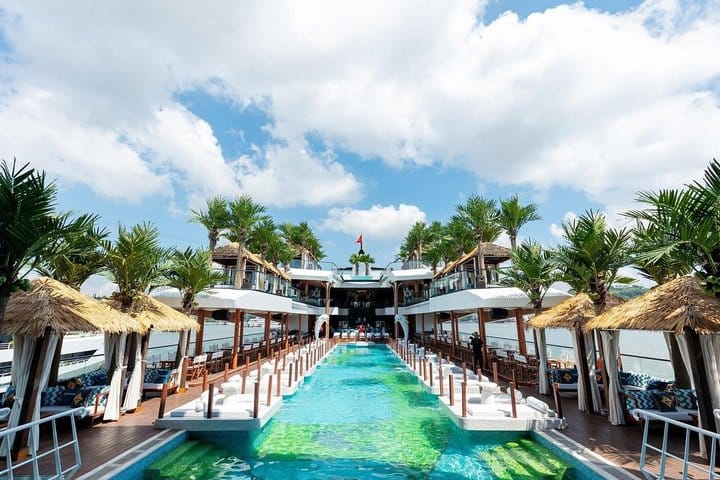 Set sail aboard the Dolphin Ha Long Day Cruise, a premier 5-star experience that elevates luxury on the water. Indulge in exceptional amenities, from a private swimming pool and vibrant onboard entertainment to an exquisite buffet lunch. Cruise past Ha Long Bay’s iconic limestone karsts, bask in the sunshine on the expansive sundeck, or take a refreshing dip in crystal-clear waters. Seamlessly blending breathtaking scenery, relaxation, and lively ambiance, this modern luxury cruise promises an unforgettable day on the bay.